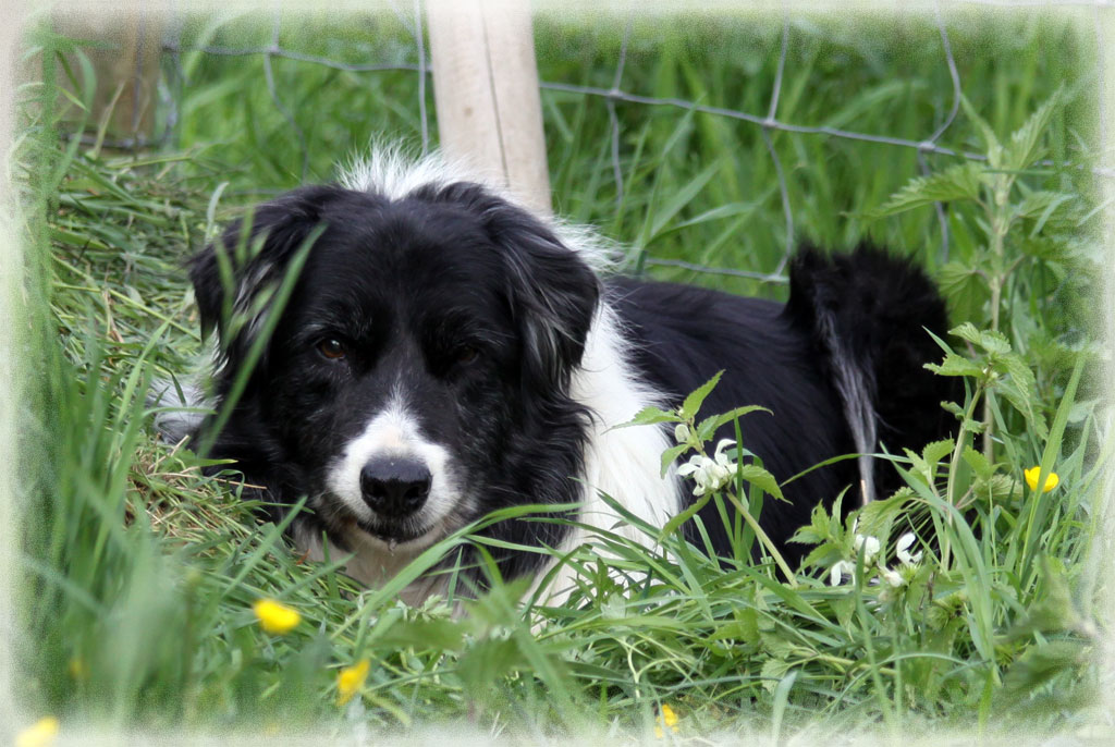 Aber das alleine macht einen Bollerbären und schon gar nicht den Ur-Bollerbär aus. Oskar war ein so liebenswürdiger Hund, der ohne viel federlesens jede Situation unter Jungspunten klärte und für Ruhe sorgte. Dabei verlor er nie die Contenance. Selbstverständlich war er in seinen jungen Jahren auch ein Draufgänger und Hans Dampf in allem Gassen. In guter Erinnerung habe ich die Erzählungen von Annette, wo sie berichetet, wie der Ausbrecherkönig Oskar aus dem ausbruchssicheren Heim ausgebüchst war, um die läufige Hündin in der Nachbarschaft zu besuchen (diese Eigenschaft hat er nicht versäumt, an seine männlichen Nachkommen weiter zu geben). In zunehmenden Alter wurde er ruhiger und gelassener. In seinen letzten Jahren fand er gefallen daran, seine Nachkommen bei der Arbeit an den Schafen zu bebachten, nicht ohne gegebenenfalls rettend einzugreifen. Heute hat er dann an einem sonnigen Herbsttag, als die Beschwerden des Alters zu groß wurden, beschlossen, seine letzte Reise über die Regenbogenbrücke anzutreten. Wir alle wünschen den Schafen hinter der Regenbogenbrücke schnelle Beine, denn jetzt kommt Oskar, der Schonzeit ist vorbei. |