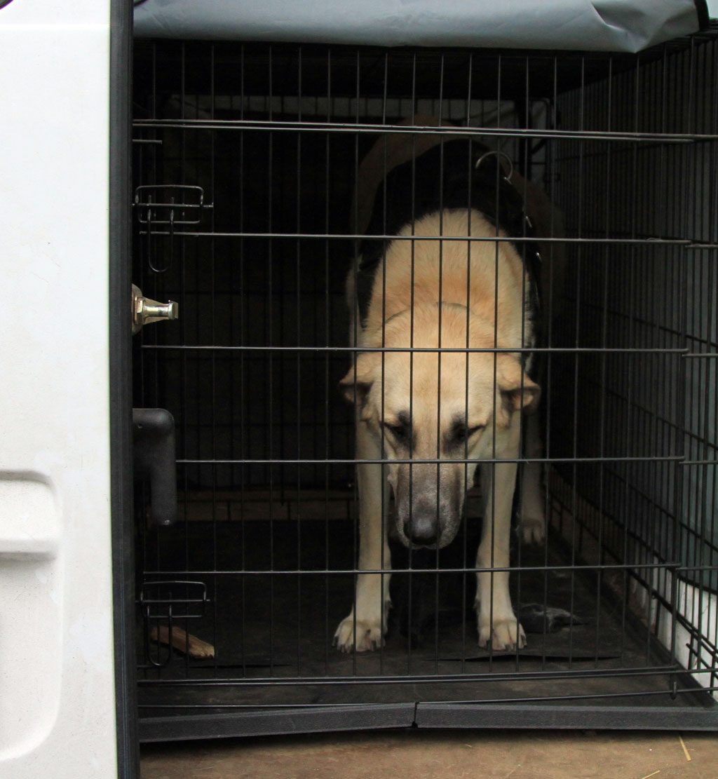 Aisha wurde in die große Hundebox verfachtet und los gings. |